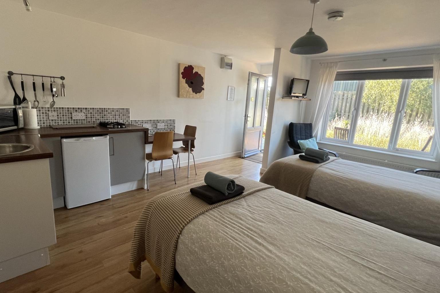 Studios 1 and 2 have shares accesses to the buildings exterior but with separate entrances within their own lobby making them ideal for friends or family to share whilst still giving the privacy you require. And with its own dining space and kitchenette with sink, microwave and fridge its also perfect for that quick break without feeling like one of those claustrophobic hotel rooms. Dogs are welcome , there is an additional charge and additional T&C