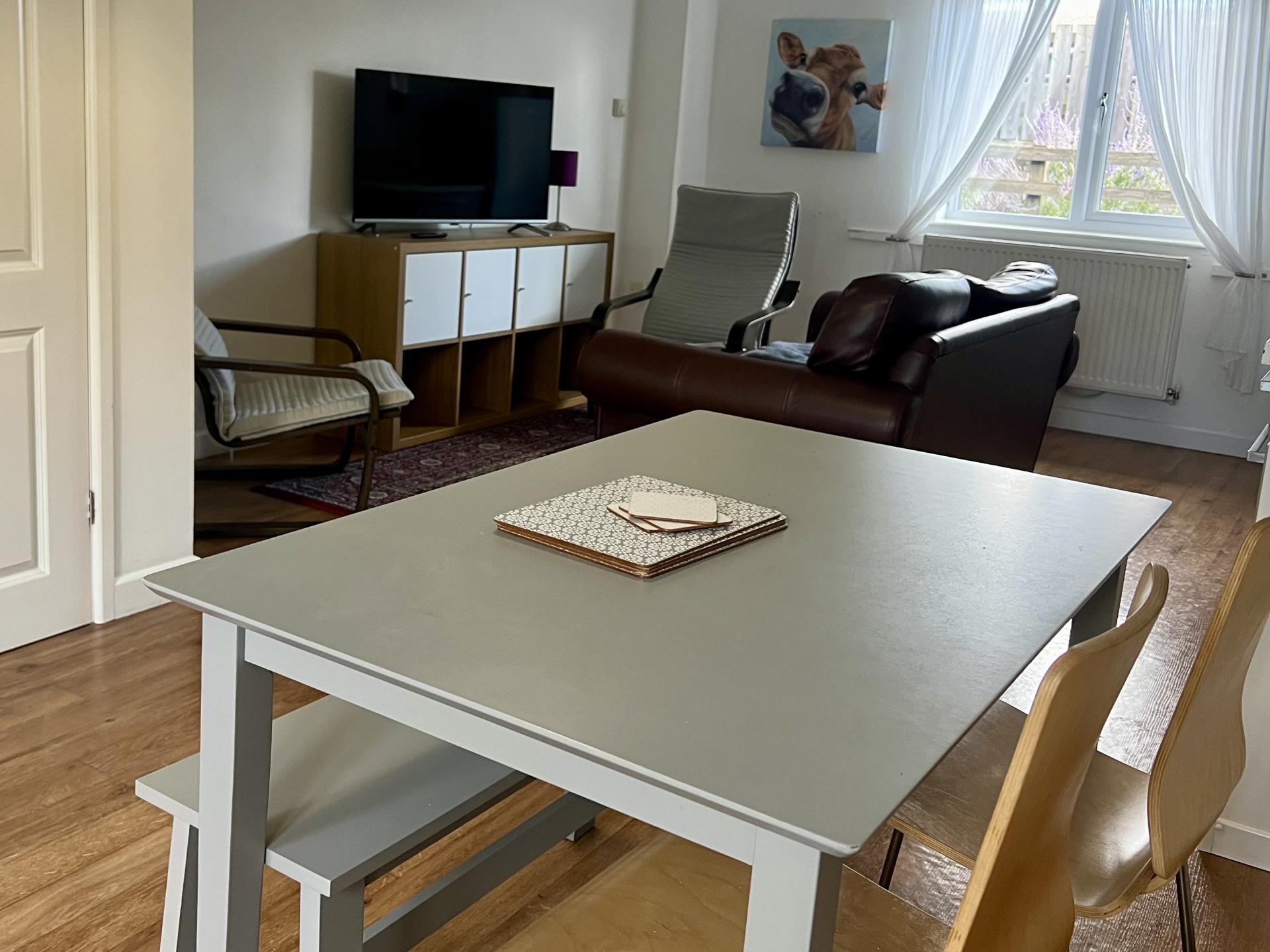 is tucked away at the far end of a beautiful courtyard garden, offering a tranquil retreat. Step directly from the garden into the spacious open-plan kitchen, dining, and living area. The fully-fitted kitchen features an oven and grill, hob, full-size dishwasher, larder fridge-freezer, kettle, toaster, and all the essentials you'll need for a comfortable stay. The open-plan living area provides a dining table, sofa, and additional seating, perfect for relaxing and unwinding during your stay.